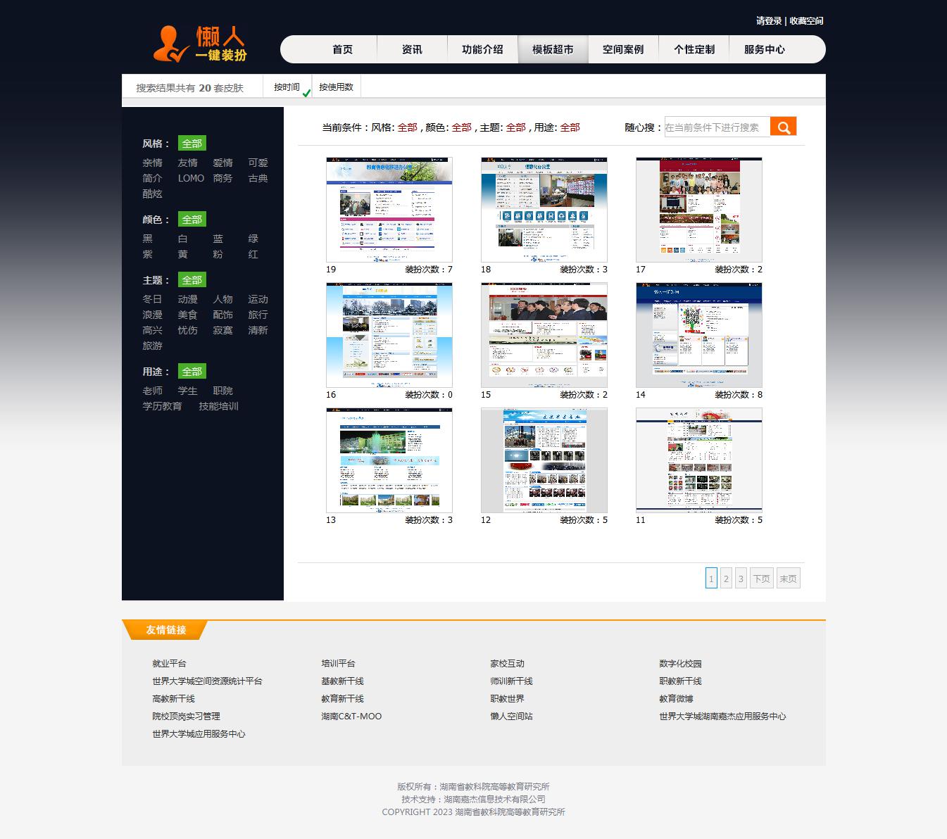 懶人一鍵裝扮系統(tǒng)是為世界大學(xué)城空間量身打造的一款一鍵式建設(shè)及美化工具。該工具為不僅為空間不同角色用戶,如:學(xué)生、老師、領(lǐng)導(dǎo)、職能處室提供了多樣性空間模板選擇,而且可以直接同步空間應(yīng)用功能,使欄目建設(shè)、文章發(fā)布、導(dǎo)航建設(shè)等功能都可以在該工具上一站完成。該工具為用戶提供了一個無需了解HTML、CSS、PS等代碼,無需學(xué)習(xí)計算機使用軟件,就可以快速打造一個美觀實用的的空間,解決了用戶自主建站耗時長、專業(yè)要求高、操作復(fù)雜等問題。