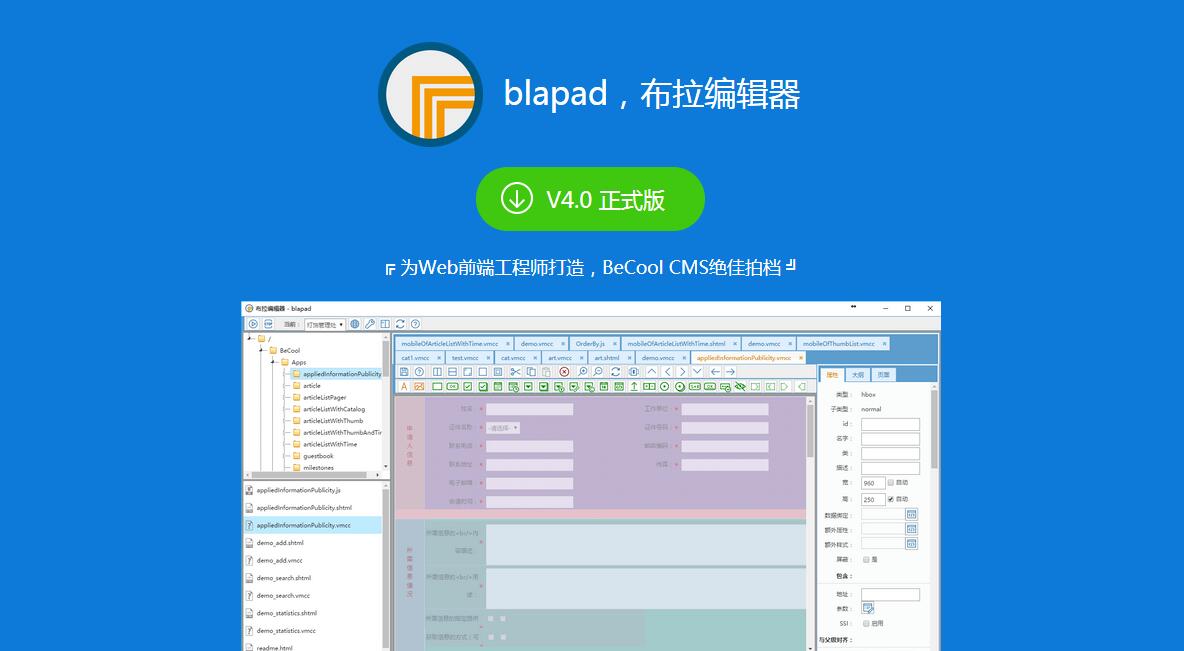 blapad - 布拉編輯器,是一款Web前端工程師使用的開發(fā)集成環(huán)境(IDE),集站點(diǎn)管理、目錄文件組織、頁面設(shè)計(jì)器、代碼編輯、生成、預(yù)覽等功能于一身。