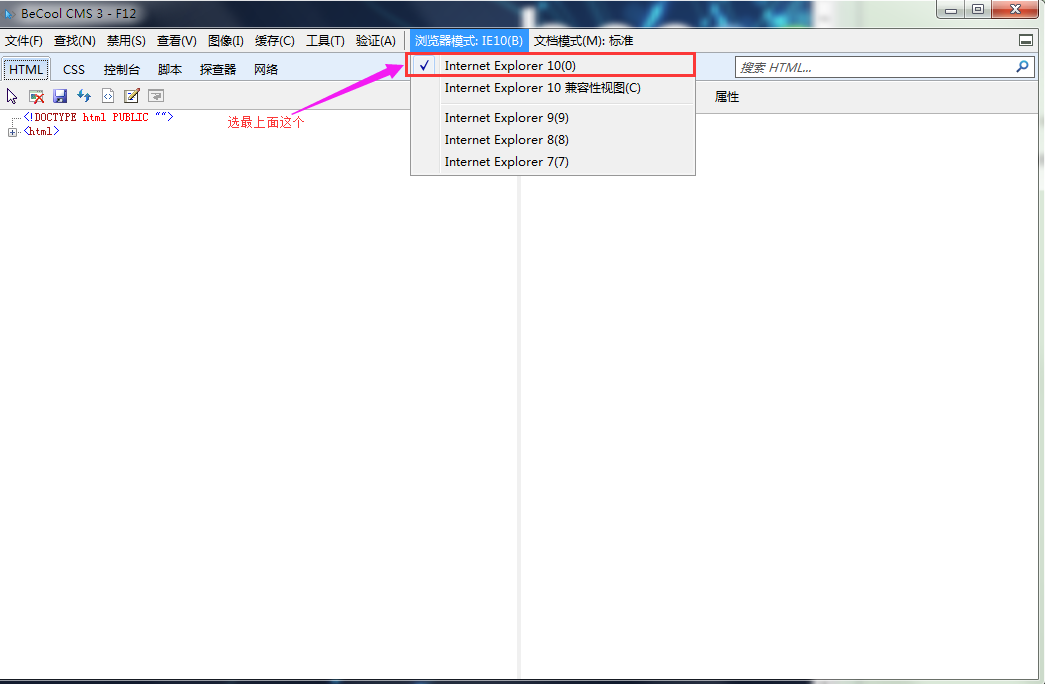 看到瀏覽器模式和文檔模式,根據(jù)IE版本選擇對應(yīng)的模式。如IE10,瀏覽器模式默認為IE10,文檔模式會默認是標準模式。注意不要選擇有“兼容性視圖”的瀏覽器模式,文檔模式會隨之變?yōu)?/span>IE7或更低版本。