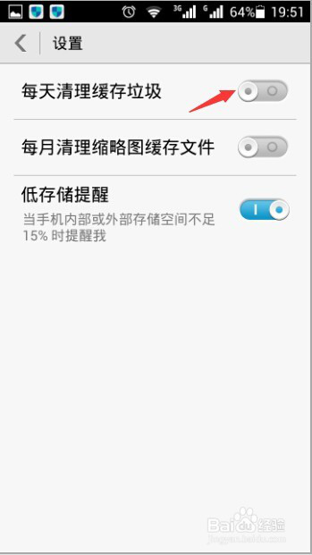 6.在“每天清理緩存垃圾”項(xiàng)目的右側(cè)默認(rèn)是關(guān)閉的,我們需要將右側(cè)的條框向右拉,變成打開狀態(tài),這樣,我們的設(shè)置就完成了。