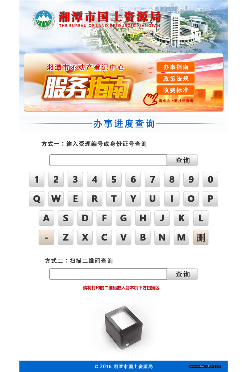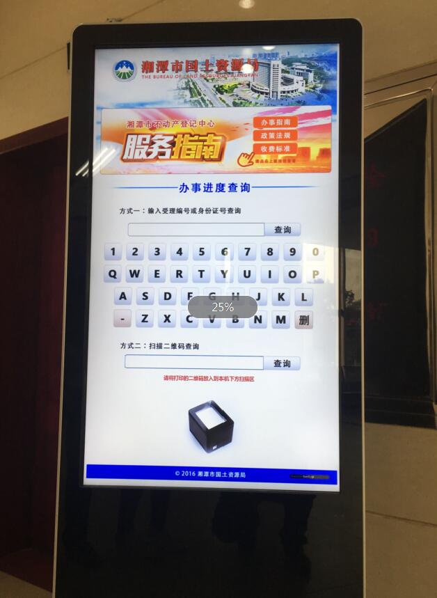 本項目為湘潭市國土資源局辦事大廳,用于群眾查詢辦事進度的觸屏機上。項目含政策法規(guī)資訊和辦事進度查詢兩塊,群眾只需在觸屏界面上輸入受理編號或身份證號,即能查詢到辦事的進度。此項目分管或下級局屬單位可軟硬件直接成套購買后使用。